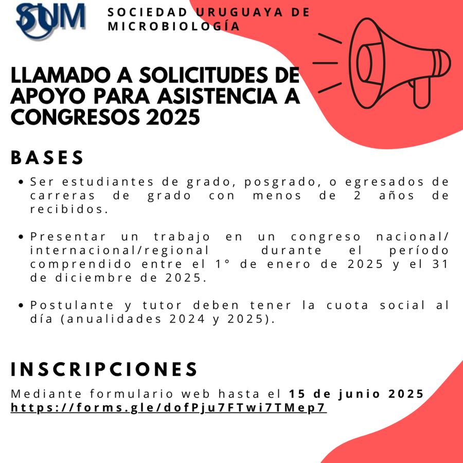 La Comisión Directiva de la SUM tiene el agrado de informarles de la apertura del llamado para apoyo a asistencia a congresos 2025. Período de inscripción: Desde el 15 de mayo al 15 de junio de 2025.